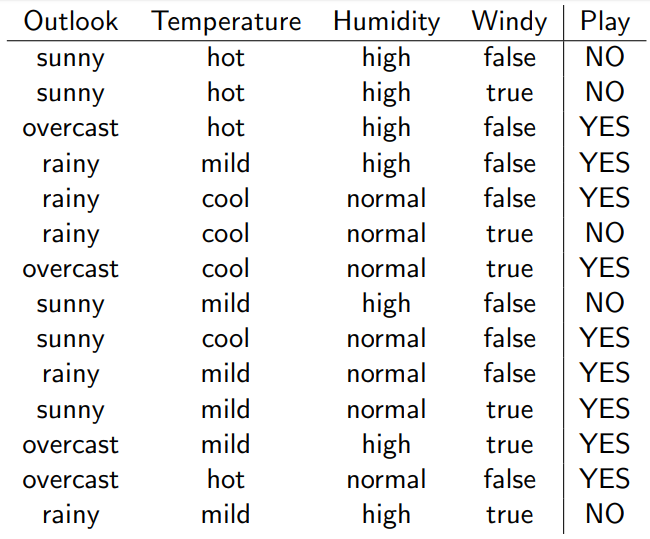 Weather dataset We can formulate the classification for 'Play' given 'Outlook, Temperature, Humidity, and Windy' as follows: