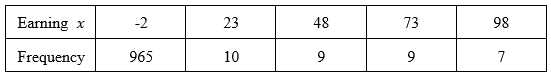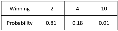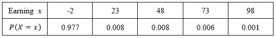Then, the chance of winning anything is: 0.001 + 0006 + 0.008 + 0.008 = 0.023. Then, the change of losing is: 1 - 0.023 = 0.977. Now the probability distribution of earning is as follows: