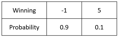 Expectation $E(X) = \sum_i^n x_i P(x_i) = (-1 \times 0.977) + \cdots + (20 \times 0.001) = -0.77$. This is the expected earning from the 1 dollar bet.