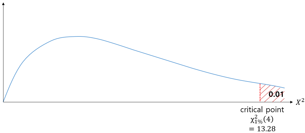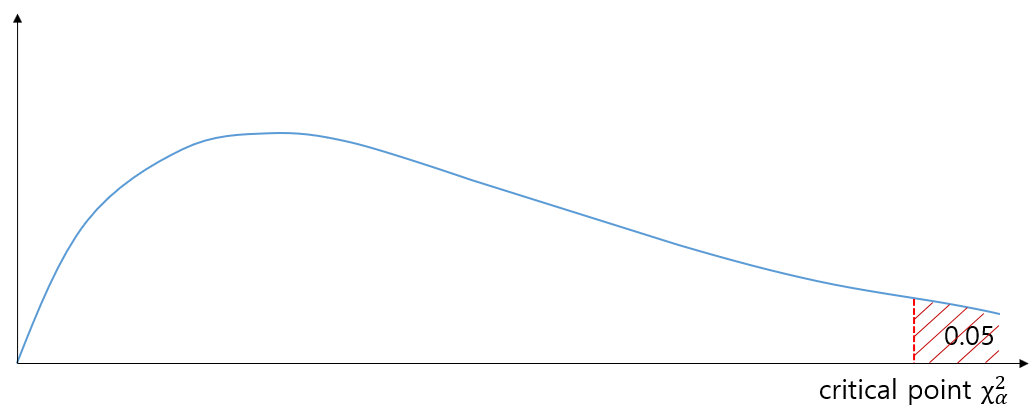 $\therefore$ If $X^2$ from the sample is within the critical region, we can reject $H_0$ that the observation follows the expected probability distribution.