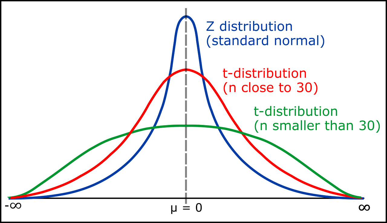 usually, the normal distribution is used for the central limit theorem. But if $n$ (a number in a sample) is small (i.e. $n<30$), we bettr use the t-distribution as it allows more uncertainty. The t-distribution takes one parameter $\nu$ (= number of degres of freedom). It is calculated as $(n-1)$ for the t-distribution: