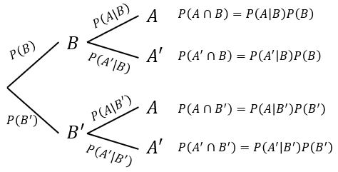 $$ = P(A|B)P(B) + P(A|B^{\prime})P(B^{\prime}) \tag{2}$$