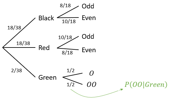 $$P(Even | Black) = 10/18 = 0.556 \tag{3} $$