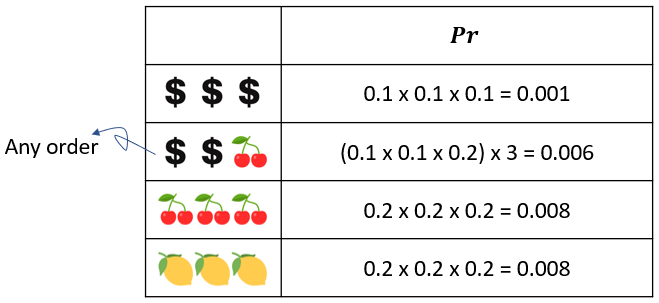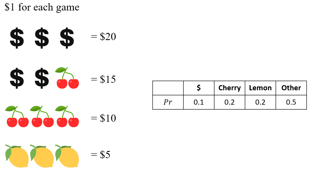 Compute long-term earnings from a slot machine. The winning and probabilities for each item are as follows: