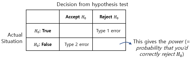 Type 2 error: We can find $P(Type \: 2 \: error)$ using the test statistic described by $H_1$ instead of $H_0$.