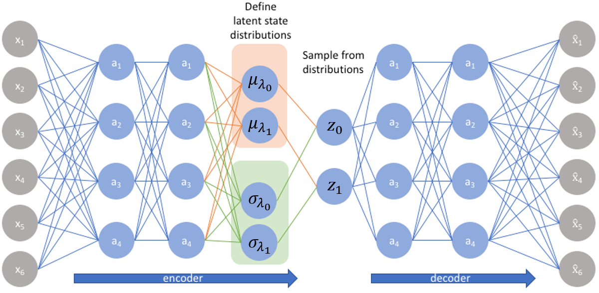 Note that exponential or softplus functions are applied to the variance terms to make them always positive. In the figure, the latent embedding space is 2-dimensional and the variational parameters are: