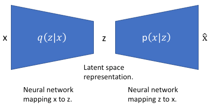 We define $x$, $z$ as input and latent representation, respectively, and a neural network for the VAE is modeled as follows: