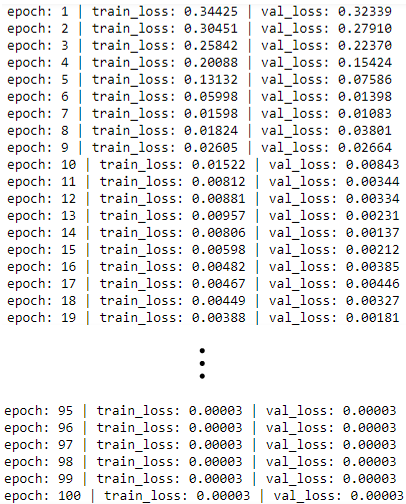 model.init_states(..)is used at the beginning of each mini-batch.# Train n_epochs = 100 for epoch in range(1, n_epochs+1): # train i, train_loss, val_loss = 0, 0., 0. for x, y in train_data_loader: optimizer.zero_grad() model.init_states(batch_size=x.shape[0]) out = model(x) loss = criterion(out, y.float().view(-1, 1)) train_loss += loss.item() loss.backward() optimizer.step() i += 1 train_loss /= i # validate with torch.no_grad(): i = 0 for x, y in val_data_loader: model.init_states(batch_size=x.shape[0]) out = model(x) loss = criterion(out, y.float().view(-1, 1)) val_loss += loss.item() i += 1 val_loss /= i print('epoch: {} | train_loss: {:0.5f} | val_loss: {:0.5f}'.format(epoch, train_loss, val_loss))Results
