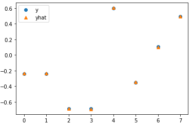 # Test with torch.no_grad(): for x, y in val_data_loader: model.init_states(batch_size=x.shape[0]) out = model(x) break #loss = criterion(out, y.float().view(-1, 1)) # Plot plt.plot(y.float(), 'o', label='y') plt.plot(out.view(-1), '^', label='yhat') plt.legend();