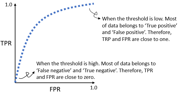 The ROC curve can be drawn by adjusting a classification threshold from zero to one. Generally, the low threshold leads to higher TPR and FPR, and vice versa: